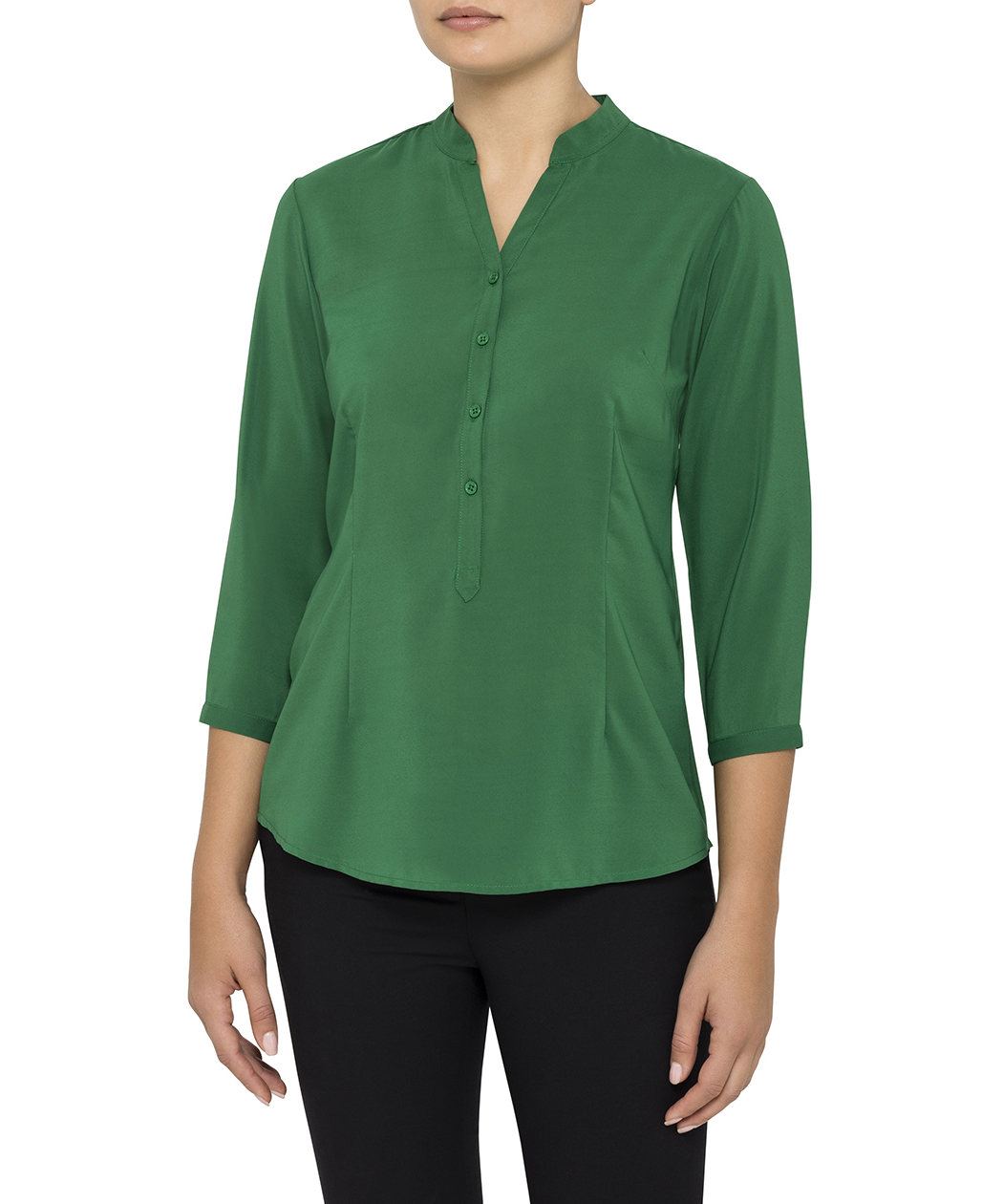 Easy Care Stretch 98% Polyester/ 2% Elastane. Stand Collar, 3/4 Sleeves and buttons on front. No ironing required. Available in Navy and Green.